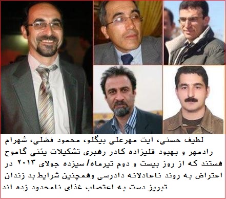 LatifHassani, Mahmoud Fazli , ShahramRadmehr , AyatMehr Ali Bayglu and BehboudGholiZade the Yeni GAMOH party leaders started unlimited hunger strike on July 13, 2013 in Tabriz Center Prison protesting their unfair trial and mistreatment.