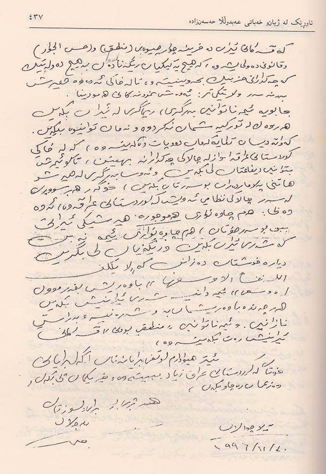 پێشمەرگەکان: ئەمەی خوارەوە دابەزاندنی نامەیەکی جەلال تاڵەبانی سکرتێری گشتیی ینک ، یە بۆ مامۆستا عەبدولا حەسەن زادە سکرتێری پێشووی حدکا کە دەقی نووسراوی دەستخەتی تالەبانی بە بێ دەستکاریی تەنانەت یەک نوقتەش دەخەینە بەردیدی خوێنەران.