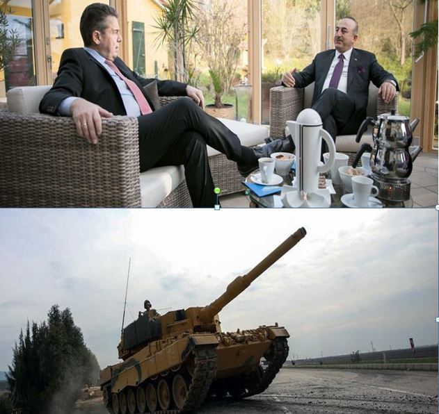 وەزیری ئابووری جارانی ئەڵمانیا Sigmar Gabriel-SPD، هاتۆتە قسە و دەڵێ : دەبێت چەک ڕەوانەکردن کەم بکەینەوە.بۆ ئەم وەزیرەی دەرەوەی ئێستا،کێشەیەکی دیکە لە چەک فرۆشتن سەری هەڵداوە. تورکیا ئەو تانکانەی لە ئەڵمانیای کڕیووە،بە ئاشکرا بەکاریان دێ لە پەلاماردان بۆ سەر کورد لە باکووری سوریا. لەدوا دیدیداری وەزیری ناوبراو لەگەڵ م. چاوشئگلو بە ئەرێنی باسی ئەمەی کرد و وتی: پێویستە تانکەکان لە تورکیا مۆدێرنە بکرێنەوە.