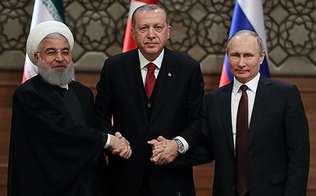 The presidents of Iran, Turkey and Russia met on April 4, 2018 for their second tripartite summit in under six months, aiming to speed the peace process for Syria and bolster their influence in the country. / AFP PHOTO / ADEM ALTAN
