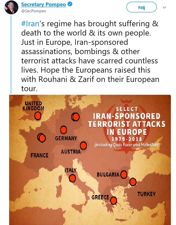 مایک پمپئو همچنین با ارائه دو نقشه، اقدامات تروریستی جمهوری اسلامی پس از انقلاب ۱۳۵۷ و گروه شبه نظامی شیعه حزب الله لبنان از بدو تشکیلش در سال ۱۳۶۱ را در کشورهای اروپایی نشان داده است.