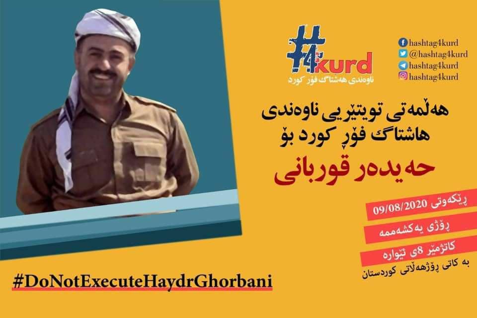 ناوەندی هاشتاگ فۆر کورد بۆ رێگریکردن لە جێبەجێکردنی سزای لەسێدارەدانی حەیدەر قوربانی شەپۆلێکی تویتەری وەڕێدەخات ، هەربۆیە داوا لە هەموو کوردستانیان و هەموو نەتەوە ئازادیخوازەکان دەکات کە یەکشەمە کاتژمێر ٨ی شەو بە کاتی ڕۆژهەڵاتی کوردستان لە هەڵمەتی تویتەری دژ بە لەسێدارەدانی حەیدەر قوربانی بەشدار بن.