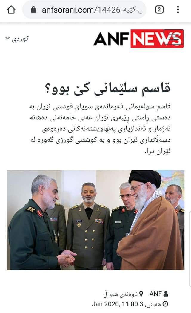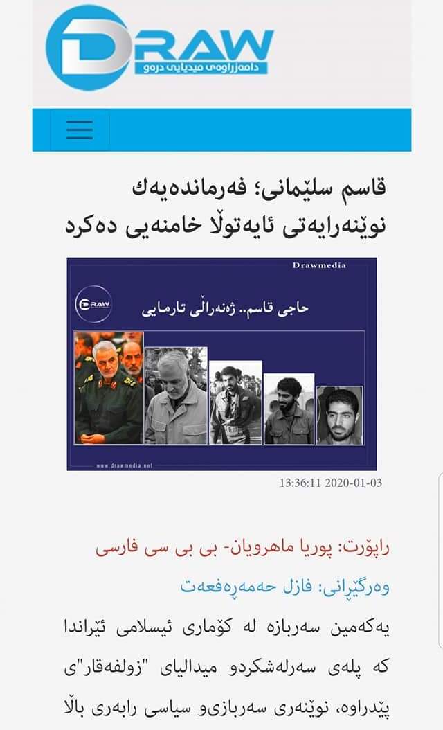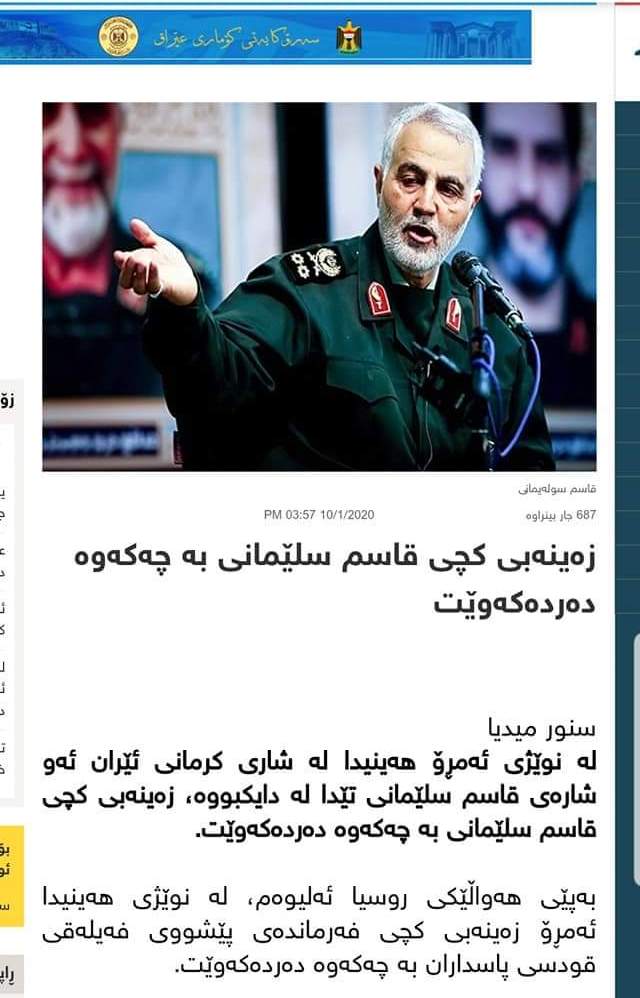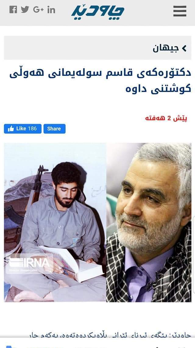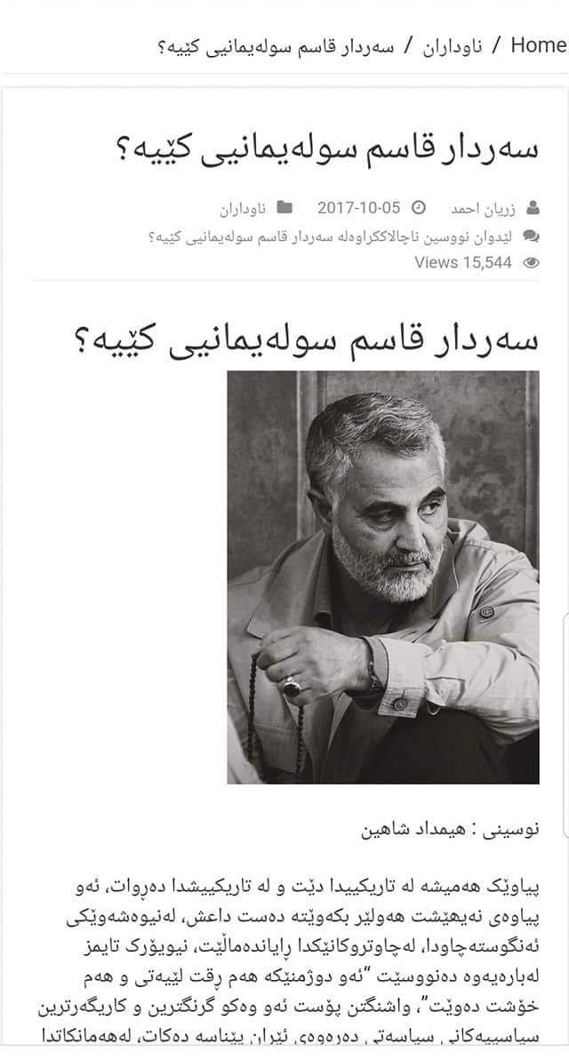 شەرم لە خۆم ئەکەم کاتێ پەیامنێر و راپۆرت و ھەواڵداڕێژی تلوێزیۆن، رادیۆ، رۆژنامەکانی ھەرێمی کوردستان ئەبینم، ئەبیسم و ئەخوێنمەوە کە گەمژانە و و نازانانە و سادەمێشکانە ”قاسم سلێمانی” تیرۆریستی ترسەنۆک ئەکەنە پاڵەوانی ئەفسانەیی لە میلەتەکەیان. نازانن بەم جۆرە سووکایەتی بە خۆیان، ئێرادەی دوژمن شکێکنیی میلەتەکەیان و نەبەزی و کۆڵنەدەری و لەشکان نەھاتوویی و قارەمانیی راستەقینەی ھەزاران پاڵەوانی فەرمانە و پێشمەرگەیان ئەکەن کە لە مەیدانەکانی شەڕی بەرگری و پاراستنی میلەتە ئەنفال و کیماباران کراوەکەیانا، سەدان ژنڕاڵی فسفس پاڵەوان و ترسەنۆکی وەک قاسم سلێمانییان خۆڵی ژێرپێیان حیساب نەدەکرد!