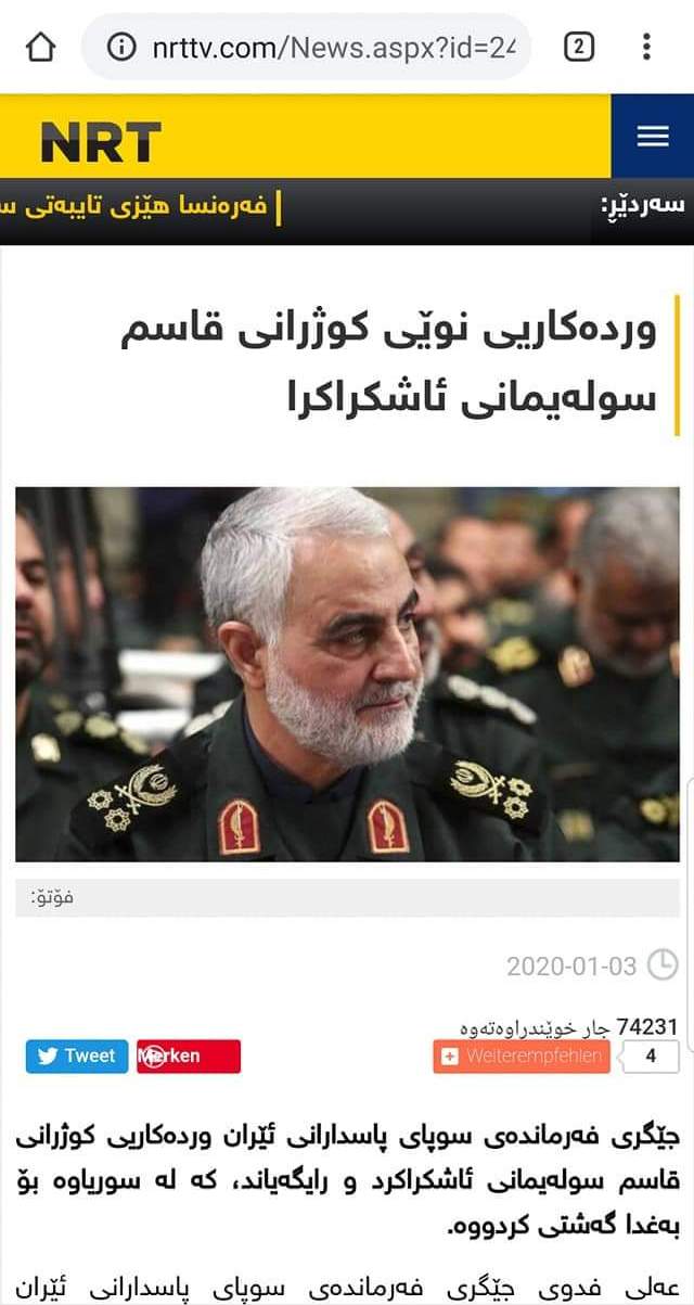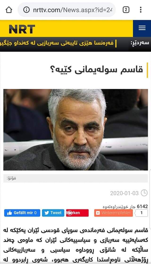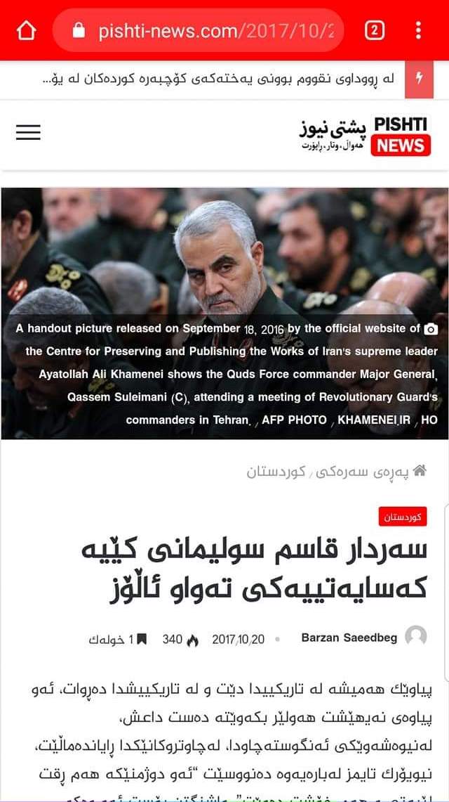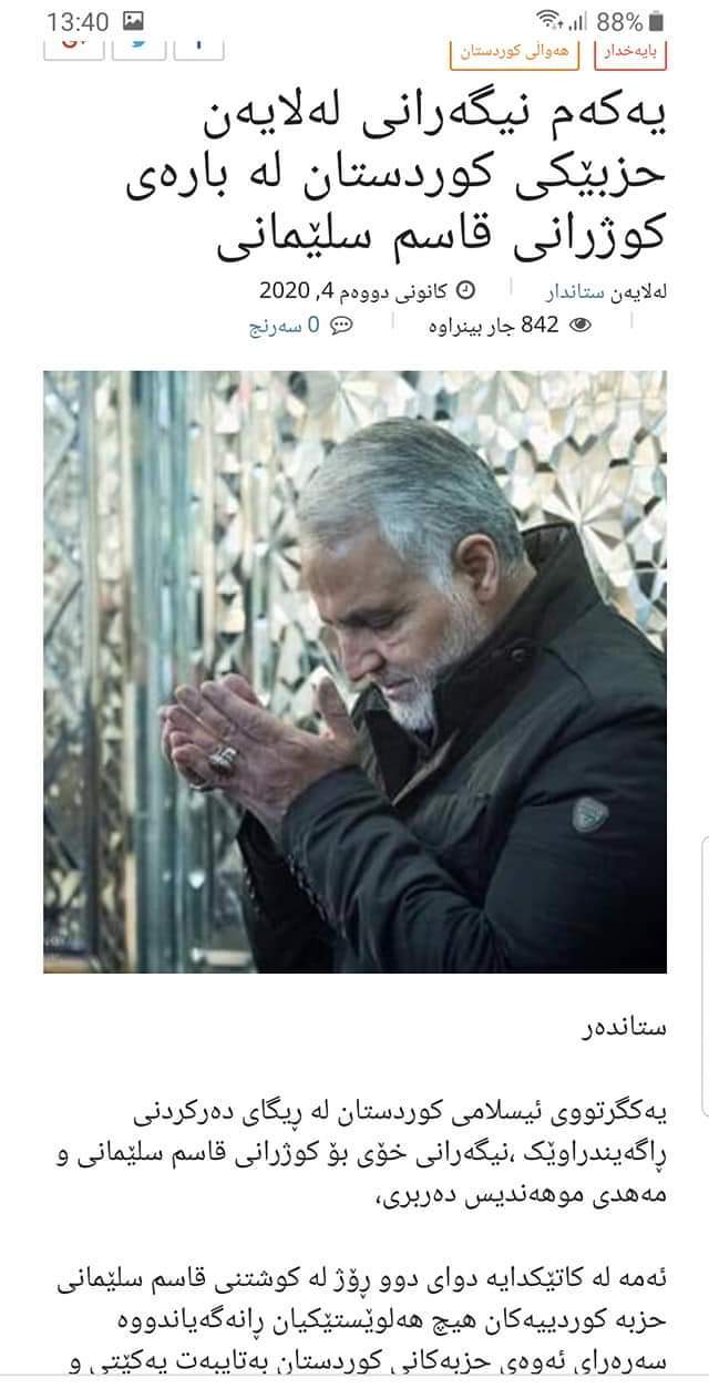 شەرم لە خۆم ئەکەم کاتێ پەیامنێر و راپۆرت و ھەواڵداڕێژی تلوێزیۆن، رادیۆ، رۆژنامەکانی ھەرێمی کوردستان ئەبینم، ئەبیسم و ئەخوێنمەوە کە گەمژانە و و نازانانە و سادەمێشکانە ”قاسم سلێمانی” تیرۆریستی ترسەنۆک ئەکەنە پاڵەوانی ئەفسانەیی لە میلەتەکەیان. نازانن بەم جۆرە سووکایەتی بە خۆیان، ئێرادەی دوژمن شکێکنیی میلەتەکەیان و نەبەزی و کۆڵنەدەری و لەشکان نەھاتوویی و قارەمانیی راستەقینەی ھەزاران پاڵەوانی فەرمانە و پێشمەرگەیان ئەکەن کە لە مەیدانەکانی شەڕی بەرگری و پاراستنی میلەتە ئەنفال و کیماباران کراوەکەیانا، سەدان ژنڕاڵی فسفس پاڵەوان و ترسەنۆکی وەک قاسم سلێمانییان خۆڵی ژێرپێیان حیساب نەدەکرد!
