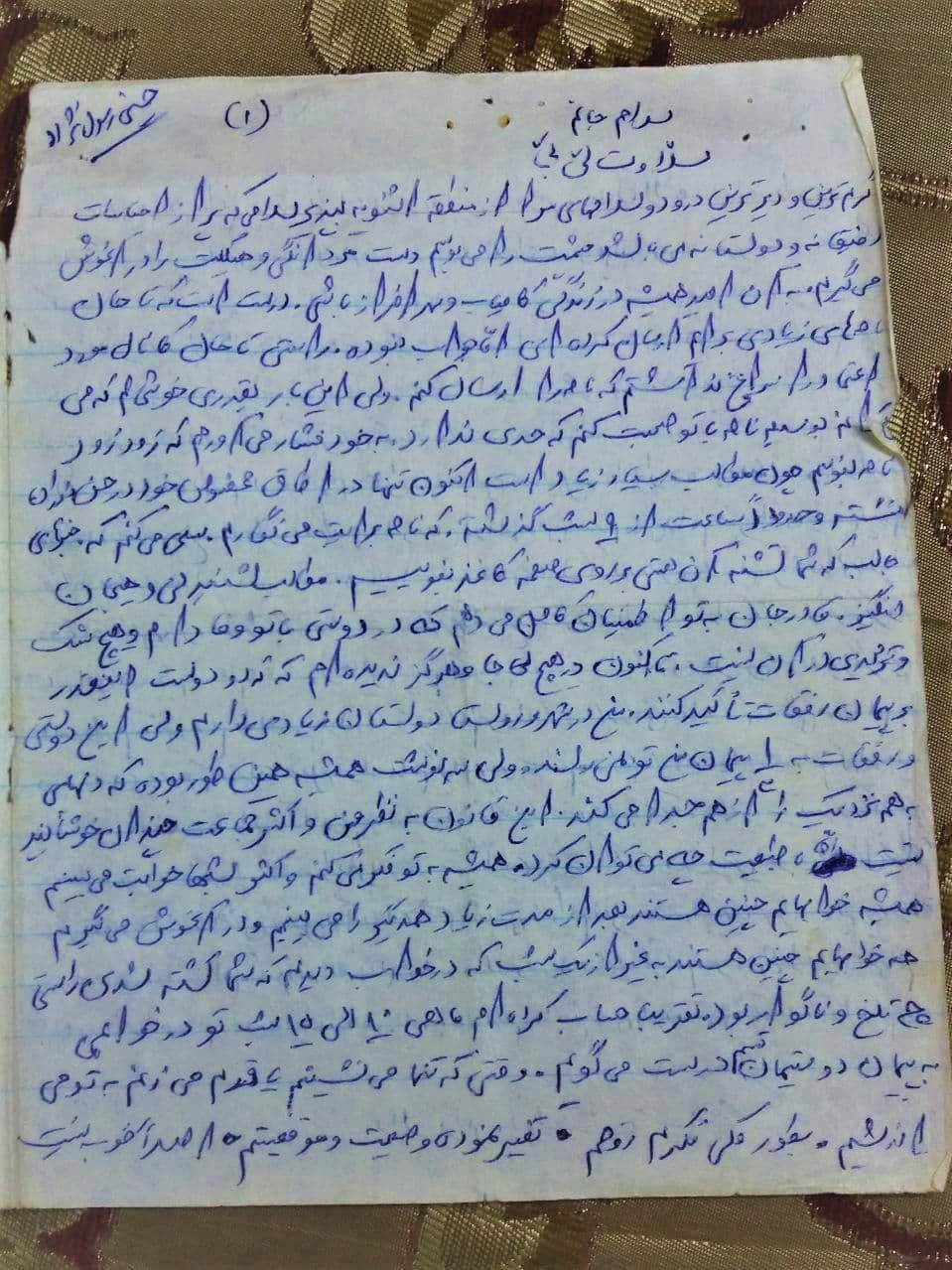 ”سڵاو گیانەکەم! سڵاوت لێ بێ. گەرمترین و درەنگترین سڵاوەکانی من لە ناوچەی شنۆوە وەربگرە؛ سڵاوێک کە پڕە لە هەستی هاوڕێیانە و دۆستانە. چاوت ماچ دەکەم و دەستی پیاوەتی و هەیکەلت دەگرمە ئامێز. بەو هیوایەی هەموو کات ژیان بە کامت بێ و سەربەرز بی. ڕاستە کە هەتا ئێستا زۆر نامەت بۆ ناردووم بەڵام وڵامم نەبووە. ڕاستییەکەی ئەوەیە کە هەتا ئێستا کەناڵێکی جێی متمانەم شک نەدەبرد کە نامەی پێدا بنێرم. بەڵام ئەو جار ئەوەندە -لەوە کە دەتوانم بە هۆی نامەوە لە گەڵت بدوێم -خۆشحاڵم کە سنوورێکی نیە. گوشار بۆ خۆم دێنم کە(نامەکەم) خێرا خێرا بنووسم، چونکە قسەی یەکجار زۆرم هەیە. ئێستا بە تەنیا لە ژووری تایبەتیی خۆم لە حەسەننووران دانیشتووم و کات لە ٩ی شەو تێپەڕیوە کە ئەم نامەیەت بۆ دەنووسم. هەوڵ دەدەم ئەو هەواڵانەی کە تۆ تینوویانی، بێنمە سەر کاغەز، بابەتی شیاوی بیستن و هەستبزوێن.