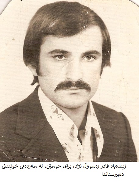 ساڵی ١٣٧٠(١٩٩١)، هەواڵم بۆ هات کاک قادر ڕەسووڵ نەژاد، براگەورەی حوسێن، بە هۆی هەورە تریشقە، گیانی لە دەست داوە. ئەم هەواڵە زۆر خەمباری کردم. چونکە جگە لەوەی برای هاوڕێیەکی زۆر خۆشەویستم بوو، هەر وەک خۆیشی، زۆرم خۆش دەویست. ئەو ساڵانەی لە گەڵ حوسێن هاومەنزڵ بوو و لە شاری شنۆ دەیخوێند، هاتوچۆم دەکردن. لەو هاتوچۆیانەدا، منیش لە ئەزموون و ڕێنوێنی و لوتف و ئامۆژگاریی ئەو سوودم وەردەگرت. دیارە ئەو دەوروبەری ٧-٨ساڵێک لە ئێمە بە تەمەنتر بوو، ساڵانی کۆتایی دەبیرستانی دەخوێند. چەند ساڵ بەر لەوەی دیپلۆم وەربگرێ، ژیانی هاوبەشی پێک هێنا. لە پیرانشار بوو بە مامۆستا (معلم)