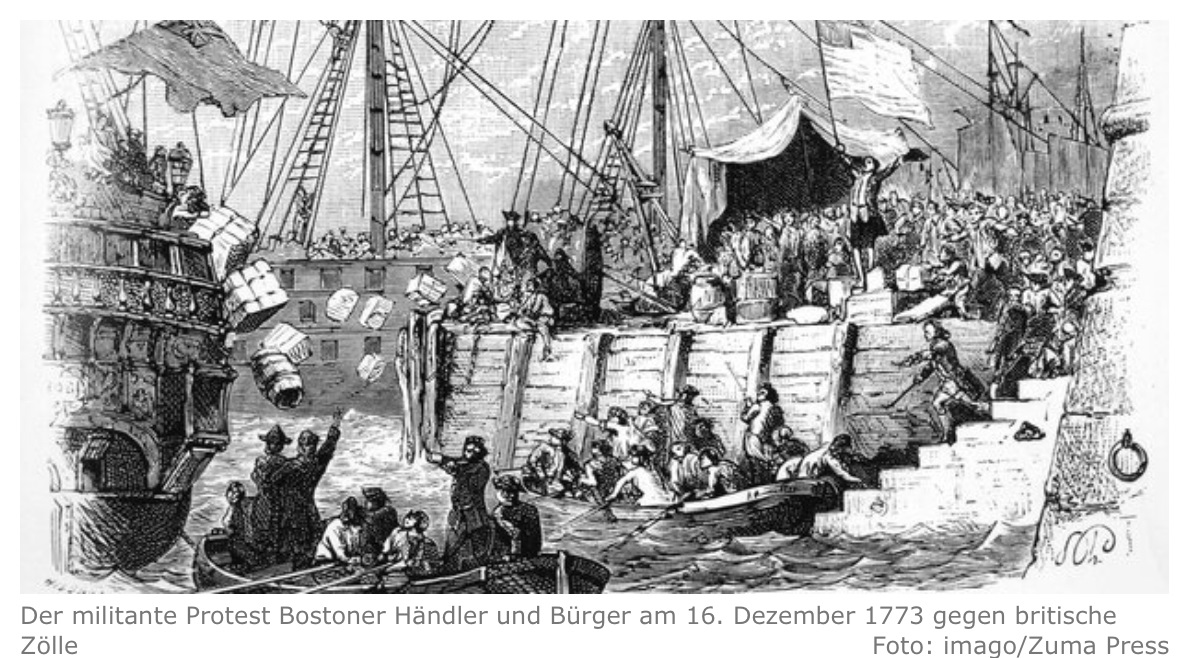 دیارە ئەمە بووە ئاڵەنگارییەکی گەورەیە بەڕووی حکومەتی پاشایەتی بەریتانیای مەزن و پاشای خاوەن شکۆدا… بۆیە ساڵی 1767 بڕیار دەدات باجی سەر زۆر شت کەم کاتەوە، بەڵام باجی سەر «چا» و «شووشە» زیاتر دەکات. چا خواردنەوە پێداویستییەکی گرنگی ڕۆژانەی خەڵکەکە بوو. کەواتە گووشارە ئابوورییەکان ڕەھەندی شەڕی دەسەڵاتیشیان وەرگرت… بەو پێیەی بەریتانیا پێی وا بوو، حاکمی سەر زەوییە و ھەر بڕیارێک بدا دەبێت جێبەجێ بکرێ و چی بوێت بەدەستی بێنێ.