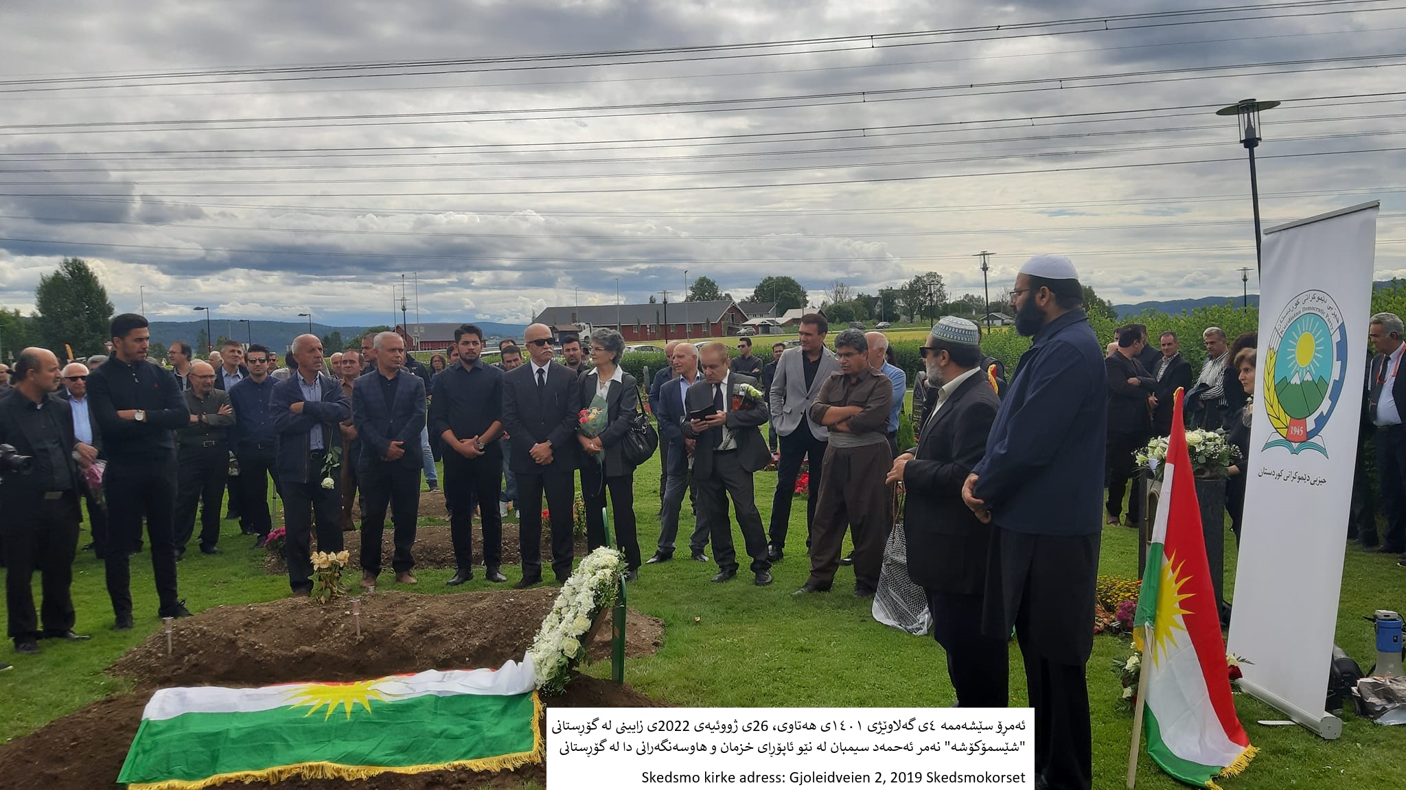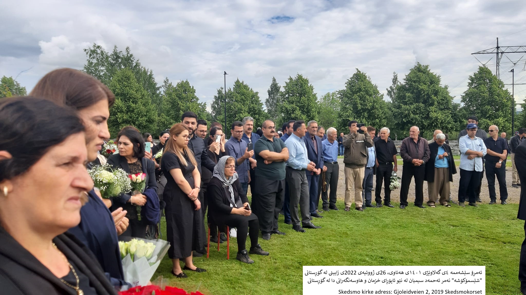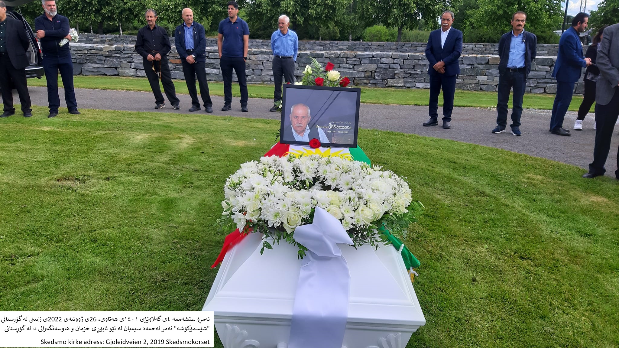 ئەمڕۆ سێشەممە ٤ی گەلاوێژی ١٤٠١ی هەتاوی، 26ی ژووئیەی 2022ی زایینی لە گۆڕستانی ”شێسمۆکۆشە” نەمر ئەحمەد سیمبان لە نێو ئاپۆڕای خزمان و هاوسەنگەرانی دا لە گۆڕستانی Skedsmo kirke adress: Gjoleidveien 2, 2019 Skedsmokorset لە وڵاتی نۆروێژ