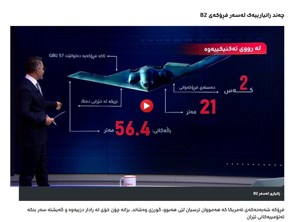 12 بۆمبی حەشارشكێنی GBU‑57یان بەسەر بنکەی ئەتۆمیی فۆردۆدا باراندن و دووی دیکەیان لە بنکەی نەتەنز دا.