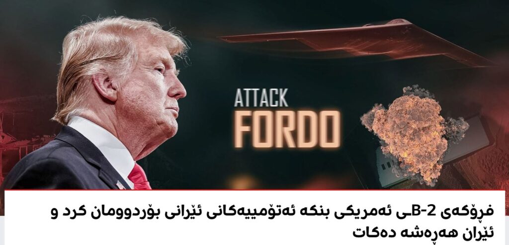 ئەمریکا خۆی یەکلایی کردەوە و لەگەڵ ئێران چووە جەنگەوە. دەوروبەری کاژێر 02:50 خولەکی بەرەبەیان دۆناڵد ترەمپ رایگەیاند، بە فڕۆکەی جەنگی و مووشەکەوە هێرشیان کردووەتە سەر بنکەی ئەتۆمیی فۆردۆ، نەتەنز و ئیسفەهانی ئێران.