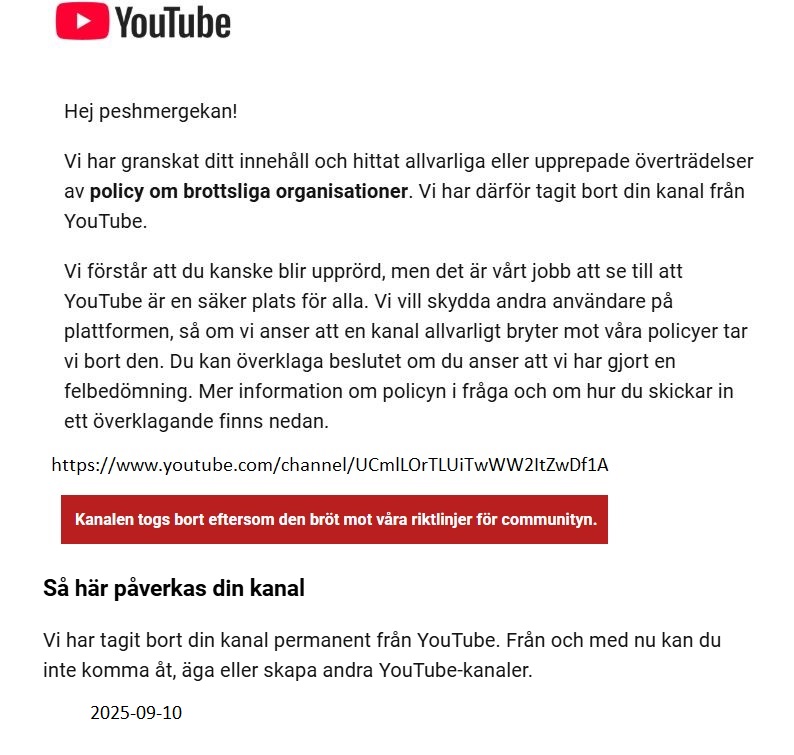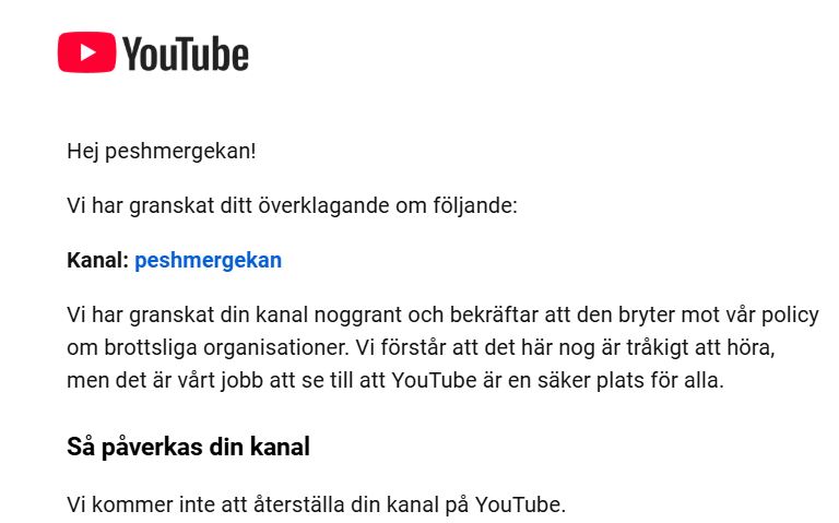 Vi har granskat din kanal noggrant och bekräftar att den bryter mot vår policy om brottsliga organisationer. Vi förstår att det här nog är tråkigt att höra, men det är vårt jobb att se till att YouTube är en säker plats för alla.