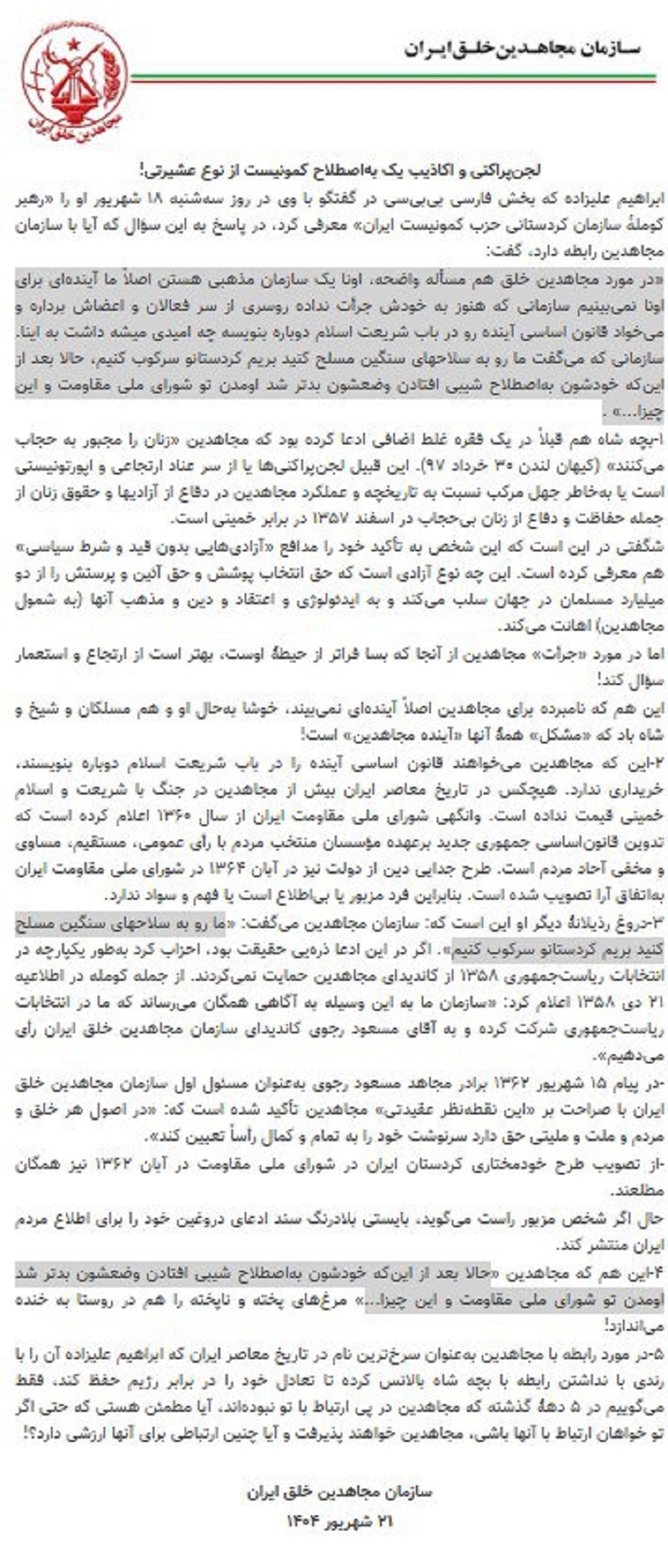سازمان مجاهدین خلق ایران اخیراً در واکنش به مصاحبه رفیق ابراهیم علیزاده، دبیر اول کومهله، با شبکه بیبیسی، اطلاعیهای پر از توهین با ادبیات غیرسیاسی منتشر کرده است. این مصاحبه به مسائل متنوعی در مورد اوضاع ایران و منطقه پرداخته و تنها حدود یک دقیقه آن به سازمان مجاهدین خلق اختصاص داشت. البته در تمام ۴۶ سال گذشته کسی نمونهای خارج از این چارچوب از سازمان مجاهدین خلق در مورد مخالفین سیاسی خود ندیده است. اگر دیده است، لطفاً یادآوری کند. سخن در مورد سازمان مجاهدین خلق فراوان است، اما ما تنها به چند نکته که به اطلاعیه اخیر آنها مربوط میشود به اختصار اشاره میکنیم: